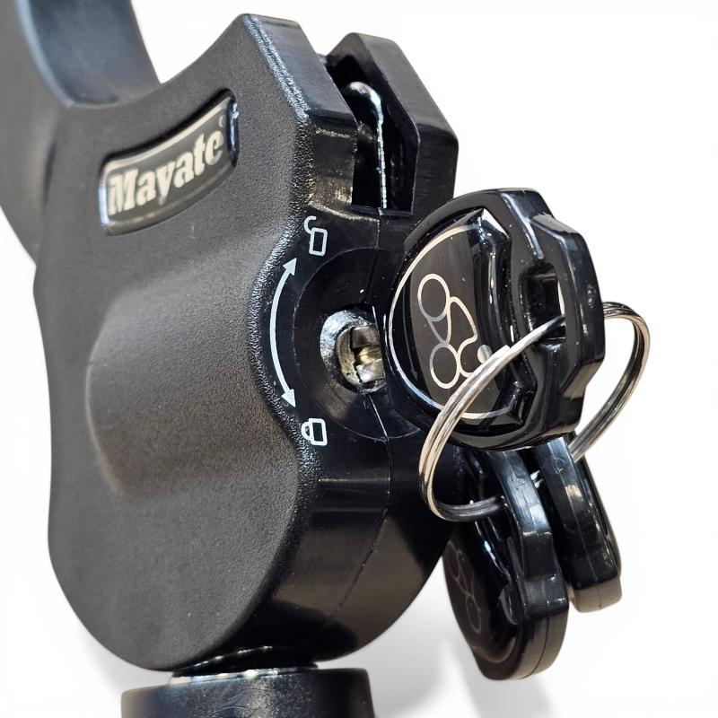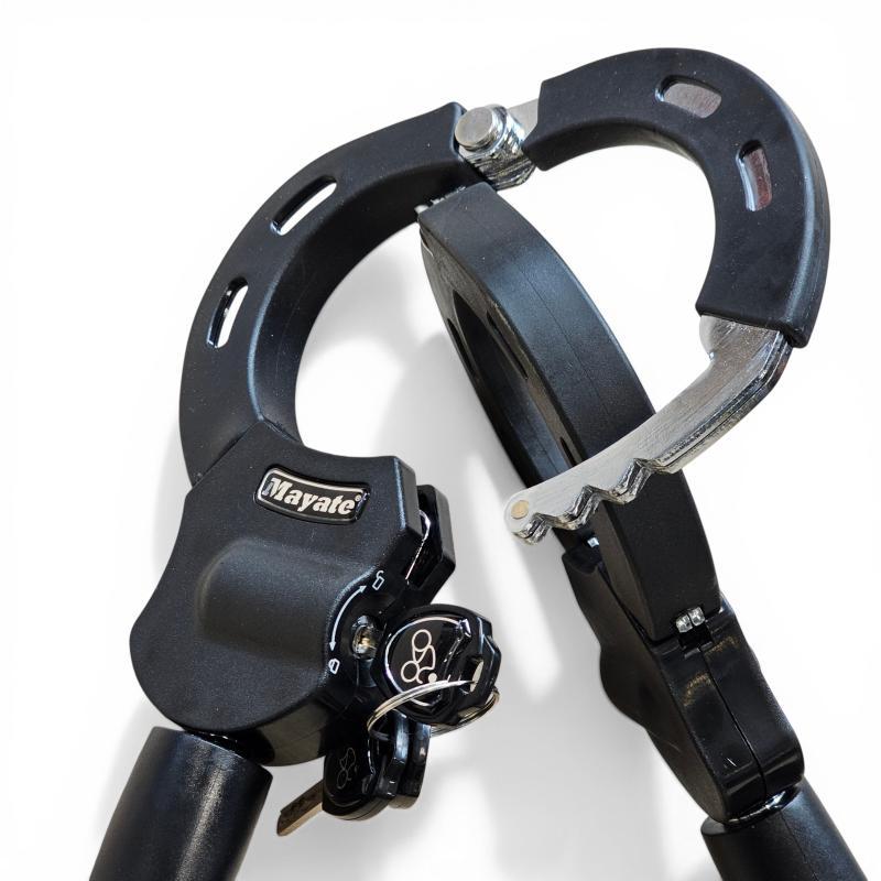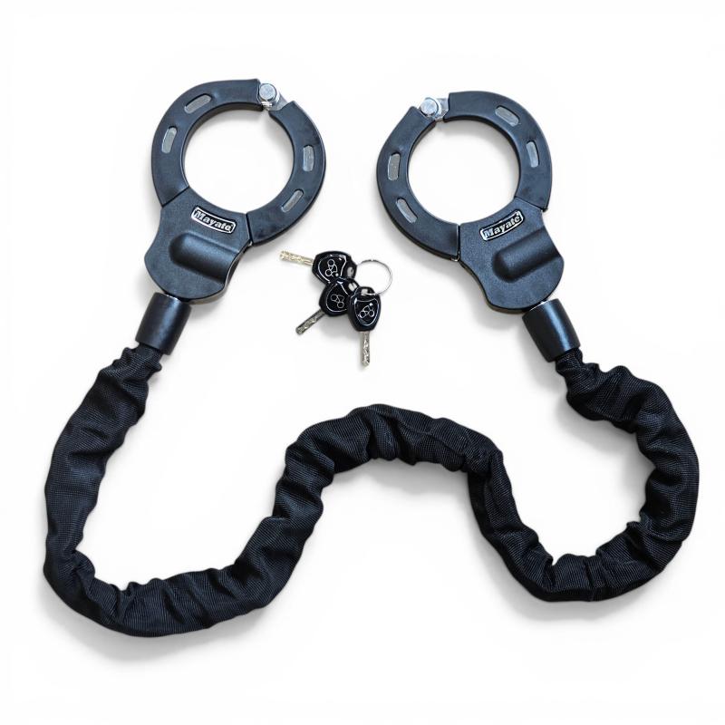 Mayate runkolukko on jykevä käsirauta-mallinen polkupyörän lukko, joka soveltuu myös sähköskootterin tai moottoripyörän lukitsemiseen. Pyörä lukitaan rungosta tai etuhaarukasta telineeseen. Järeä Street Cuff -lukko soveltuu erityisen hyvin sähköpotkulautojen lukitsemiseen. Raudat ovat kromattua terästä, jonka päällä on kumi pehmuste suojaamassa naarmuttamiselta. Pakkauksen mukana kolme kappaletta avaimia.